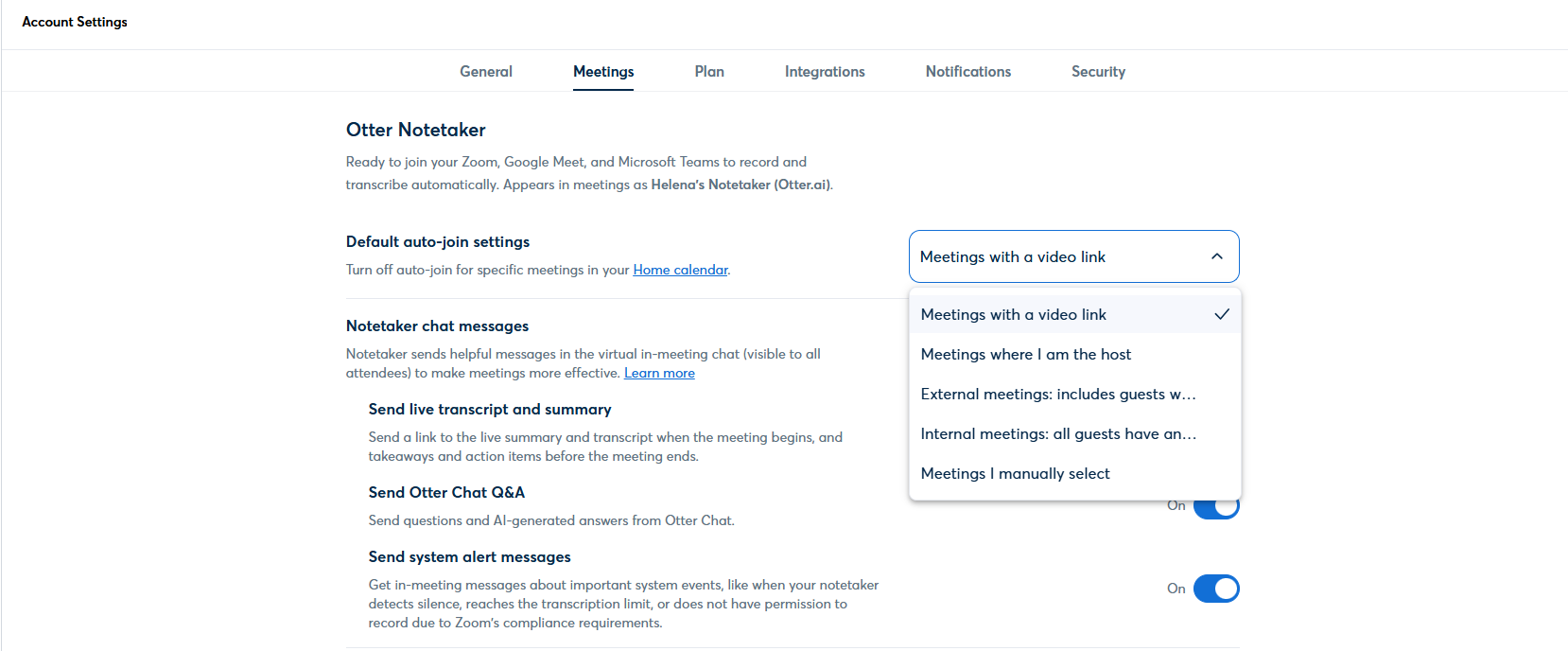 - ์๋ ์ฐธ๊ฐ ์ค์ : ์ผ์ชฝ ๋ฉ๋ด์ Account Settings > Meetings์์ Otter๊ฐ ์ด๋ค ํ์์ ๋ค์ด์ฌ์ง ์ ํํ ์ ์์ด์.